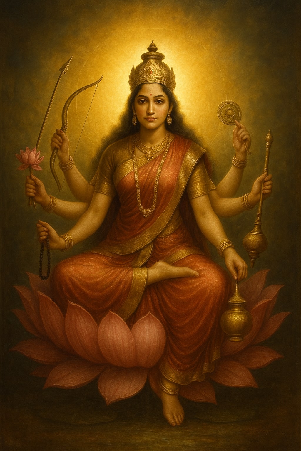 माँ कूष्मांडा की आठ भुजाएँ हैं। वे कमल, धनुष-बाण, कमंडल, चक्र, गदा, अमृतकलश, जपमाला और अभयमुद्रा धारण करती हैं।