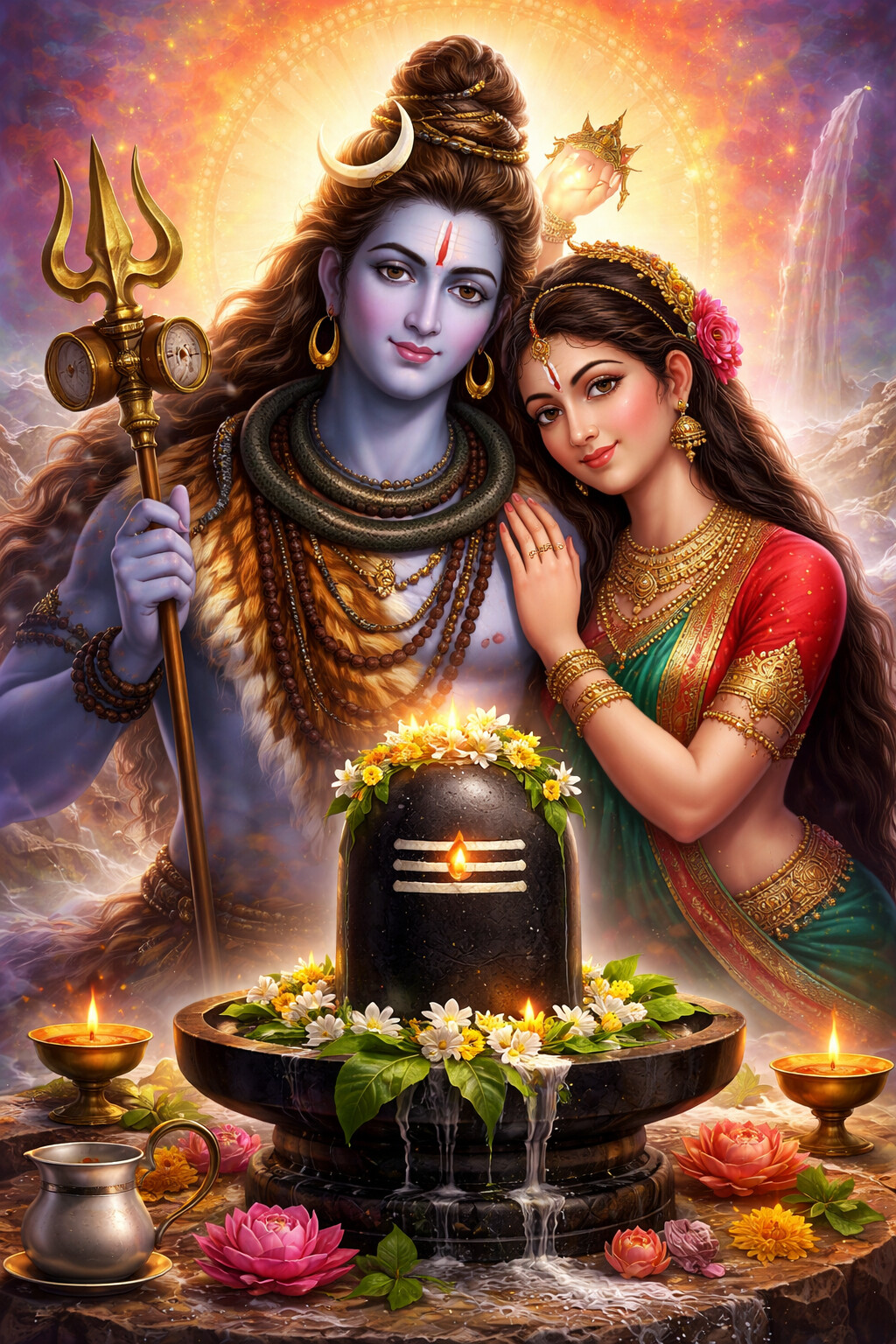 Bel Patra (Bilva leaves)  Milk, curd, honey, ghee  White flowers  Incense and diya These offerings please Lord Shiva and Goddess Parvati.